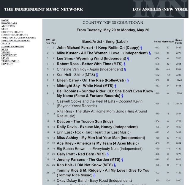 Excited that JMF country tune “I keep rollin’ on” hit #1 on Independent Music Network Top Country Radio Chart