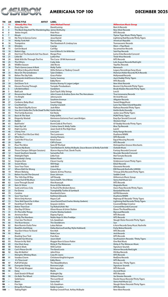 John song “already miss you” about a parent saying goodbye to her daughter is number one on the Cashbox magazine Americana chart.